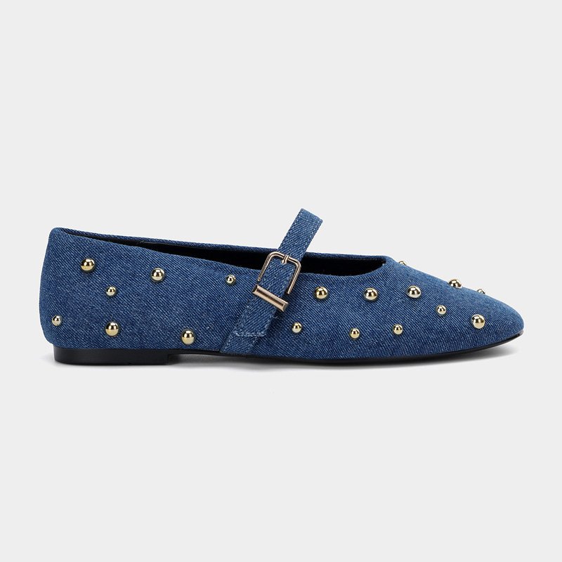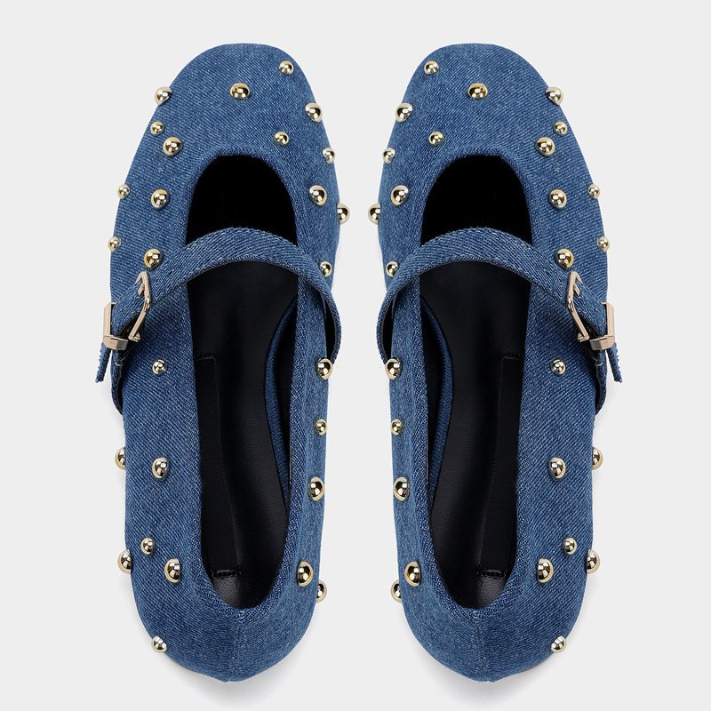 Our Urightshoes trendy denim Mary Jane flats are crafted from durable blue denim fabric, adorned with shiny gold spherical studs for a playful, edgy touch. The adjustable buckle strap ensures a secure fit, while the flexible flat sole offers all-day comfort, making them a stylish choice for pairing with casual or retro-inspired outfits.